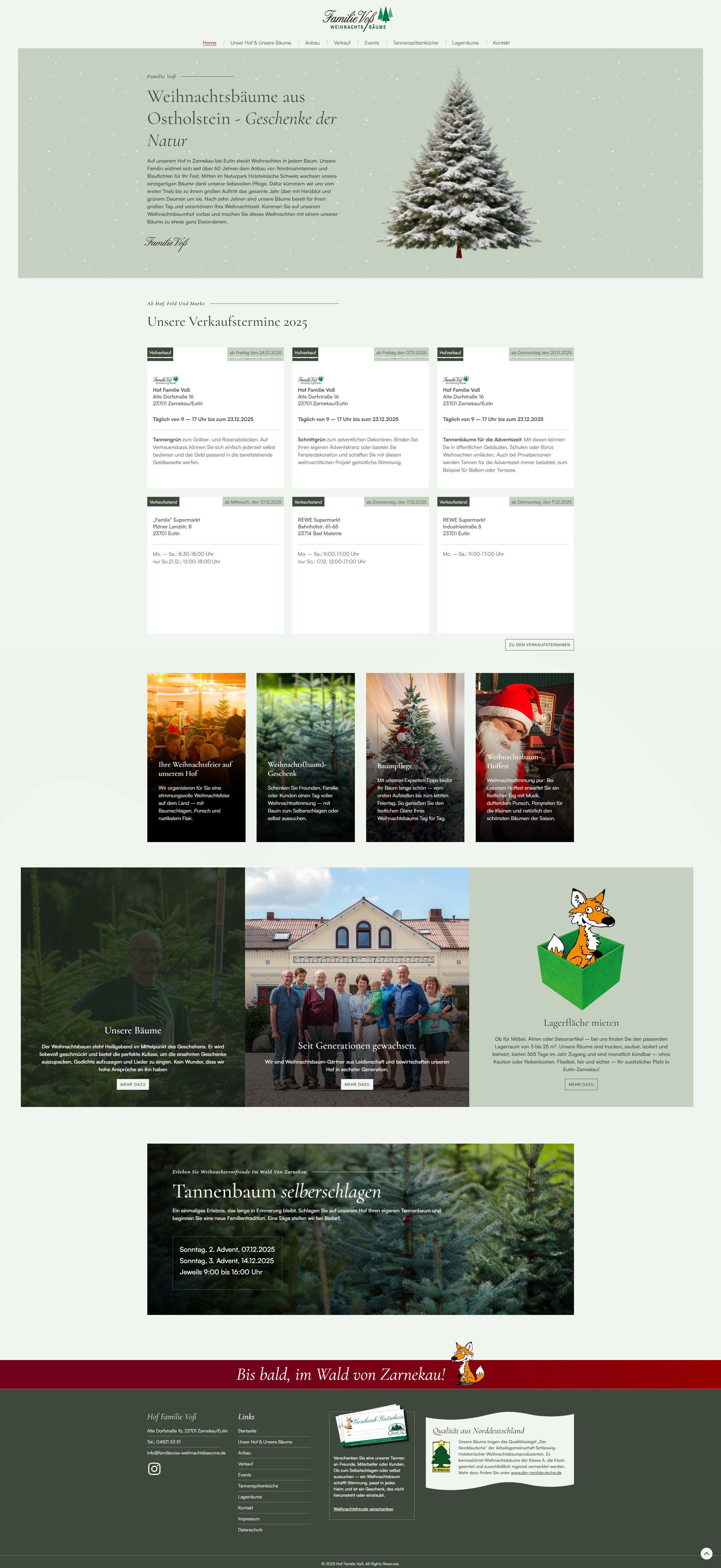 Wir haben für die Webseite der Familie Voß einen vollständigen Website-Relaunch durchgeführt. Die Website erstrahlt nun in einem neuen Look mit verschiedenen Grüntönen. Ein besonderes Design-Highlight ist der dezente Schneeeffekt, der die Besucher auf der Startseite begrüßt und in Weihnachtsstimmung versetzt. Die gesamte Seite wirkt nun homogener, und Inhalt und Design sind besser aufeinander abgestimmt. Die vorher durch Balken gegliederten Abschnitte werden nun indirekter durch farblich abgesetzte Textblöcke und passende Bilder gegliedert, wodurch sie weicher wirken.
