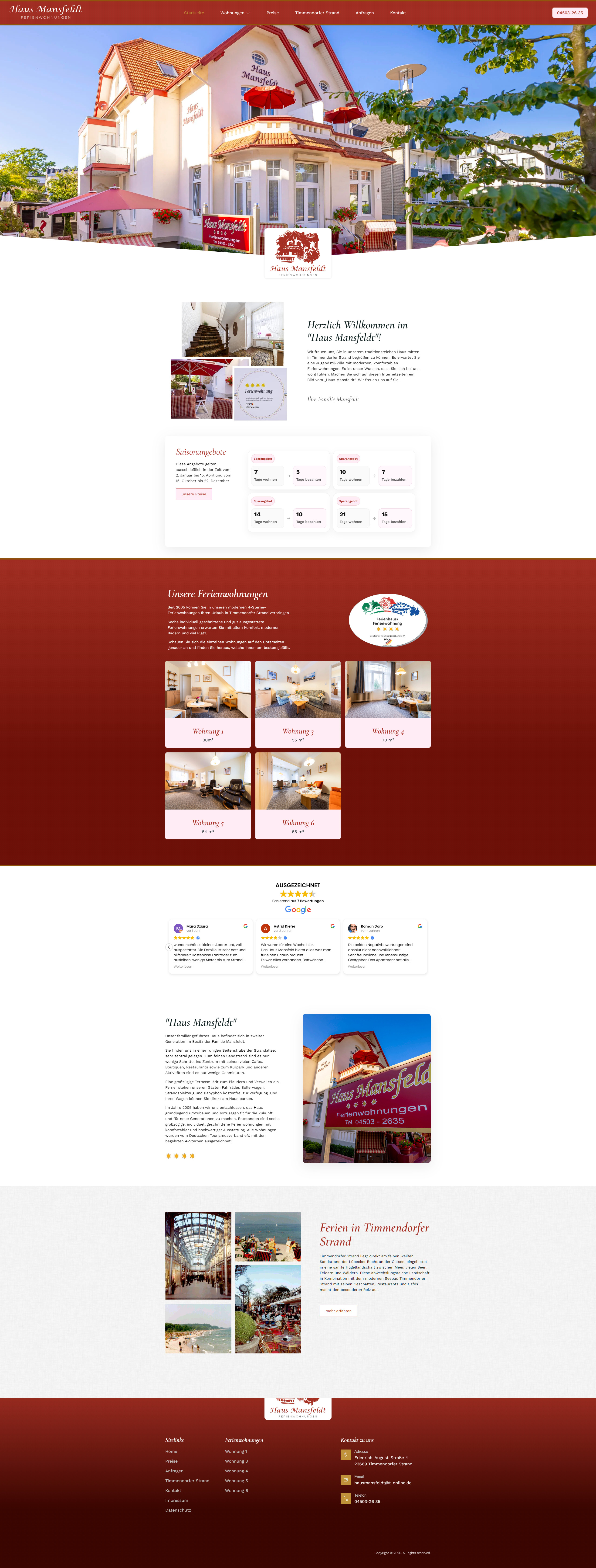 Neben dieser strukturellen Veränderungen haben wir auch das Design grundlegend geändert. Das Farbschema in Lila und Rosa ist einem seriöseren Bordeaux gewichen und das Design überzeugt nun durch farblich abgesetzte Themen-Blöcke sowie professionelle Fotos. Zu diesem Zweck haben wir ein Fotoshooting von innen und außen durchgeführt, um das Haus professionell zu präsentieren und potenzielle Gäste zu überzeugen. Hierzu dienen auch präsent platzierte Google-Bewertungen sowie ein Zertifikat vom Deutschen Tourismusverband e.V. Damit Interessierte ohne Umwege mit der Familie Mansfeldt in Kontakt treten können, haben wir ein Kontaktformular direkt auf der Website integriert, über das Fragen geklärt werden können. Für die Buchung gibt es ein eigens programmiertes, separates Tool, was die Betreiber unabhängig von den gängigen Buchungsplattformen macht.